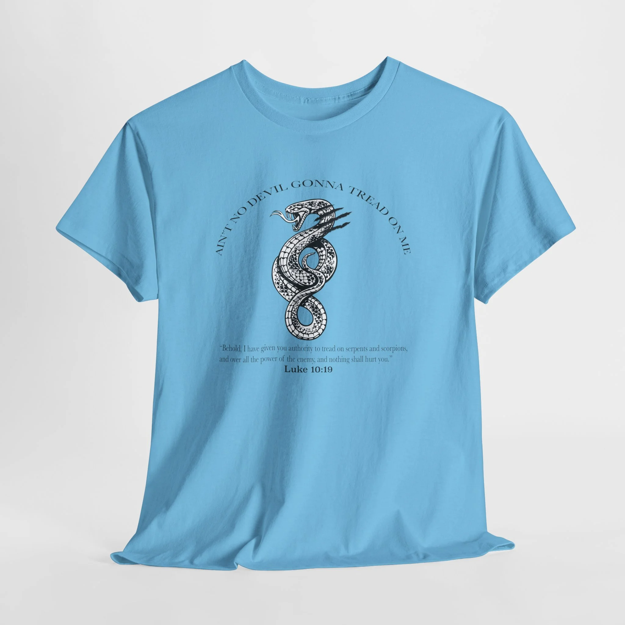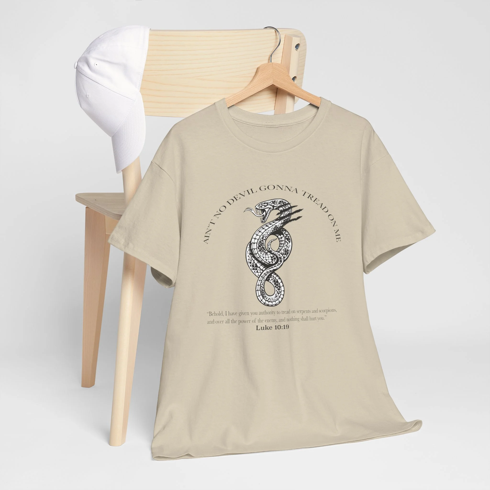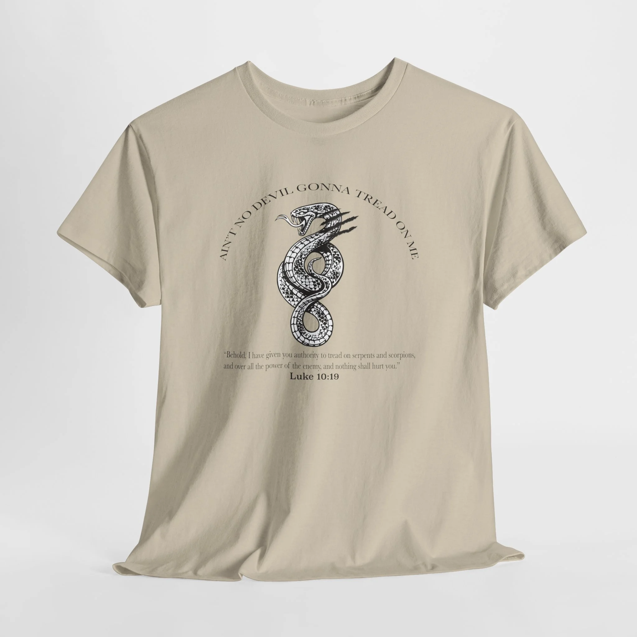This soft, breathable, classic tee carries a hand-drawn serpent illustration as a reminder that the enemy cannot touch us. The shirt feels light against the skin and holds its shape through washes, so the artwork stays crisp and readable.