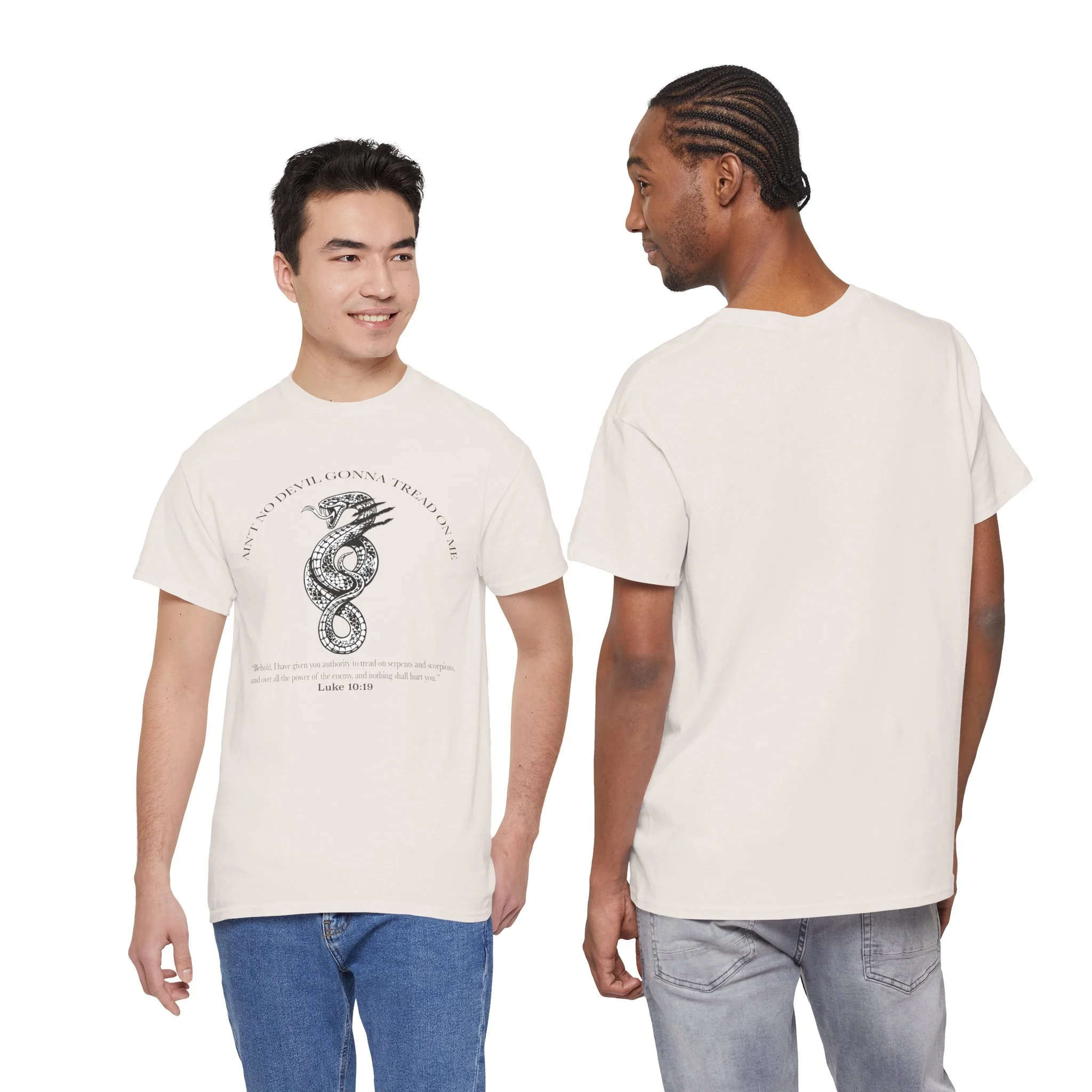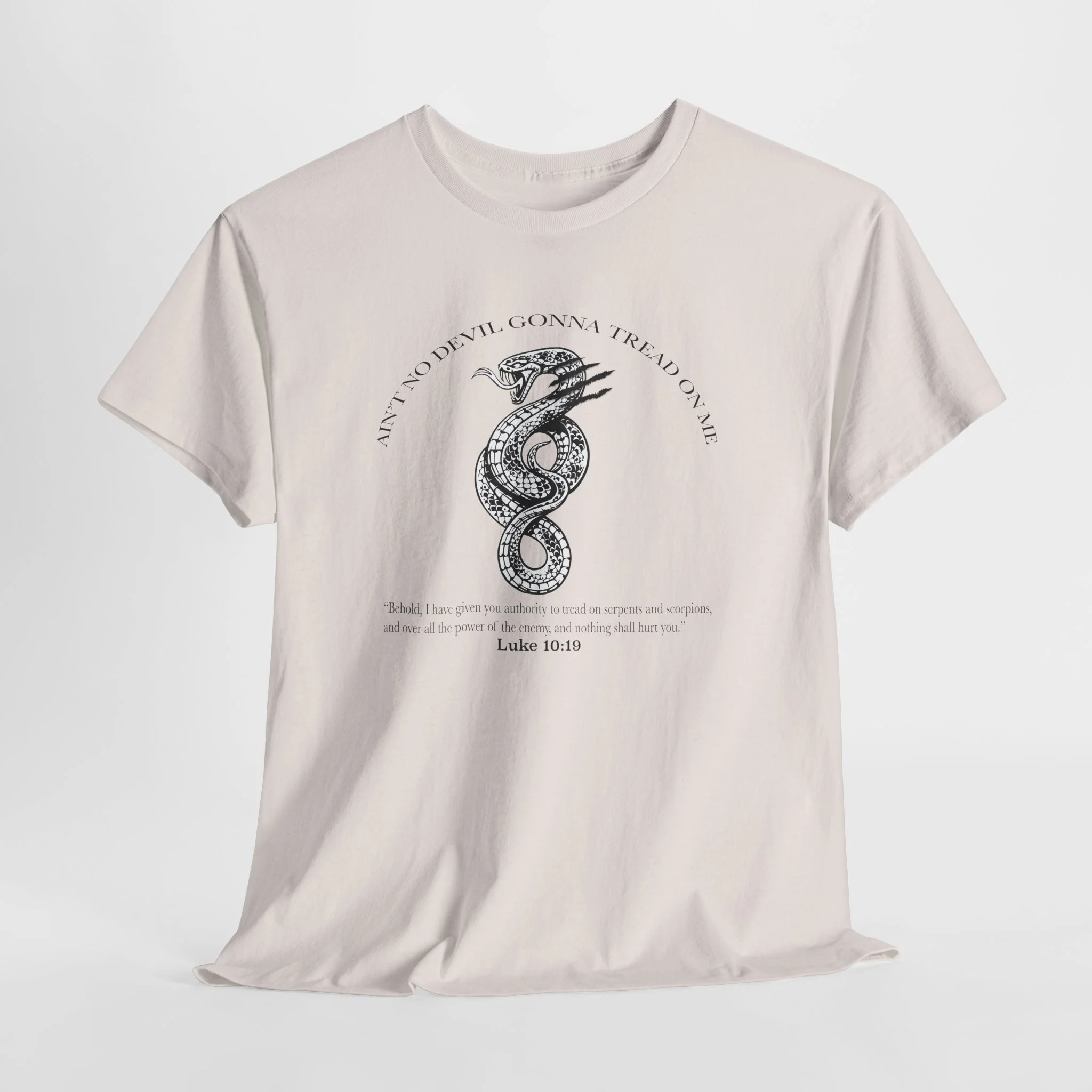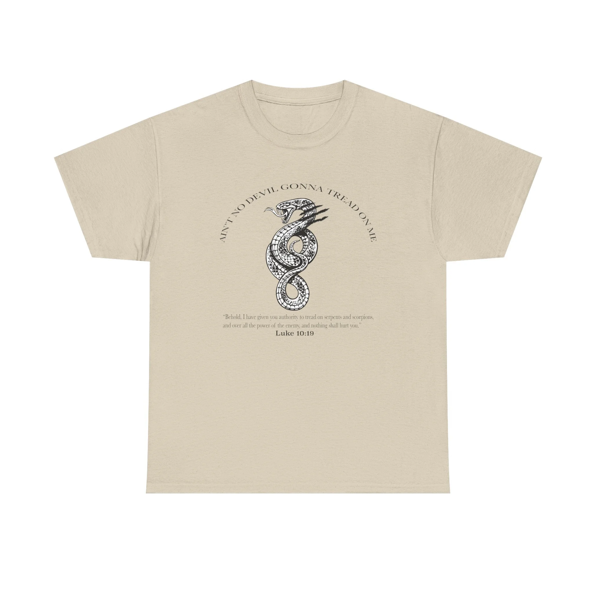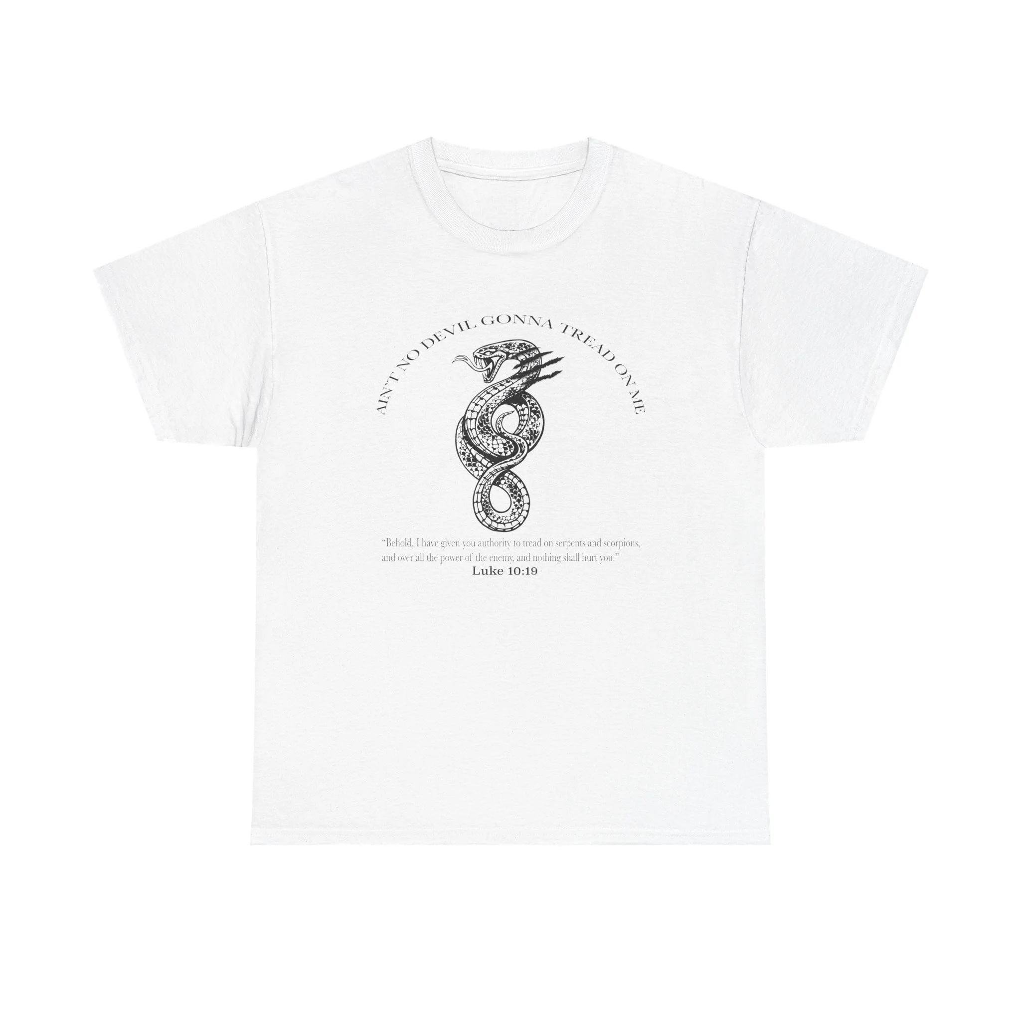 This soft, breathable, classic tee carries a hand-drawn serpent illustration as a reminder that the enemy cannot touch us. The shirt feels light against the skin and holds its shape through washes, so the artwork stays crisp and readable.