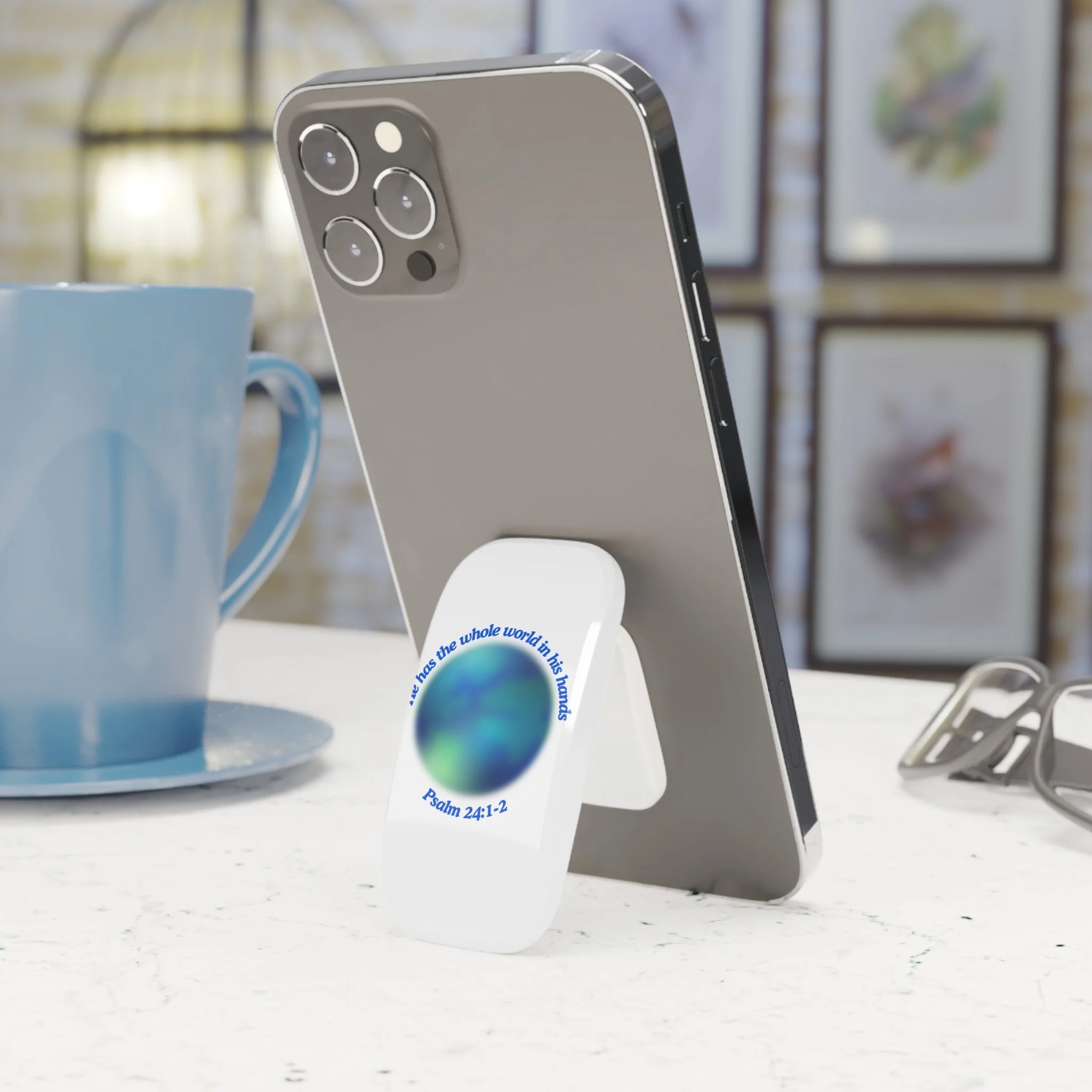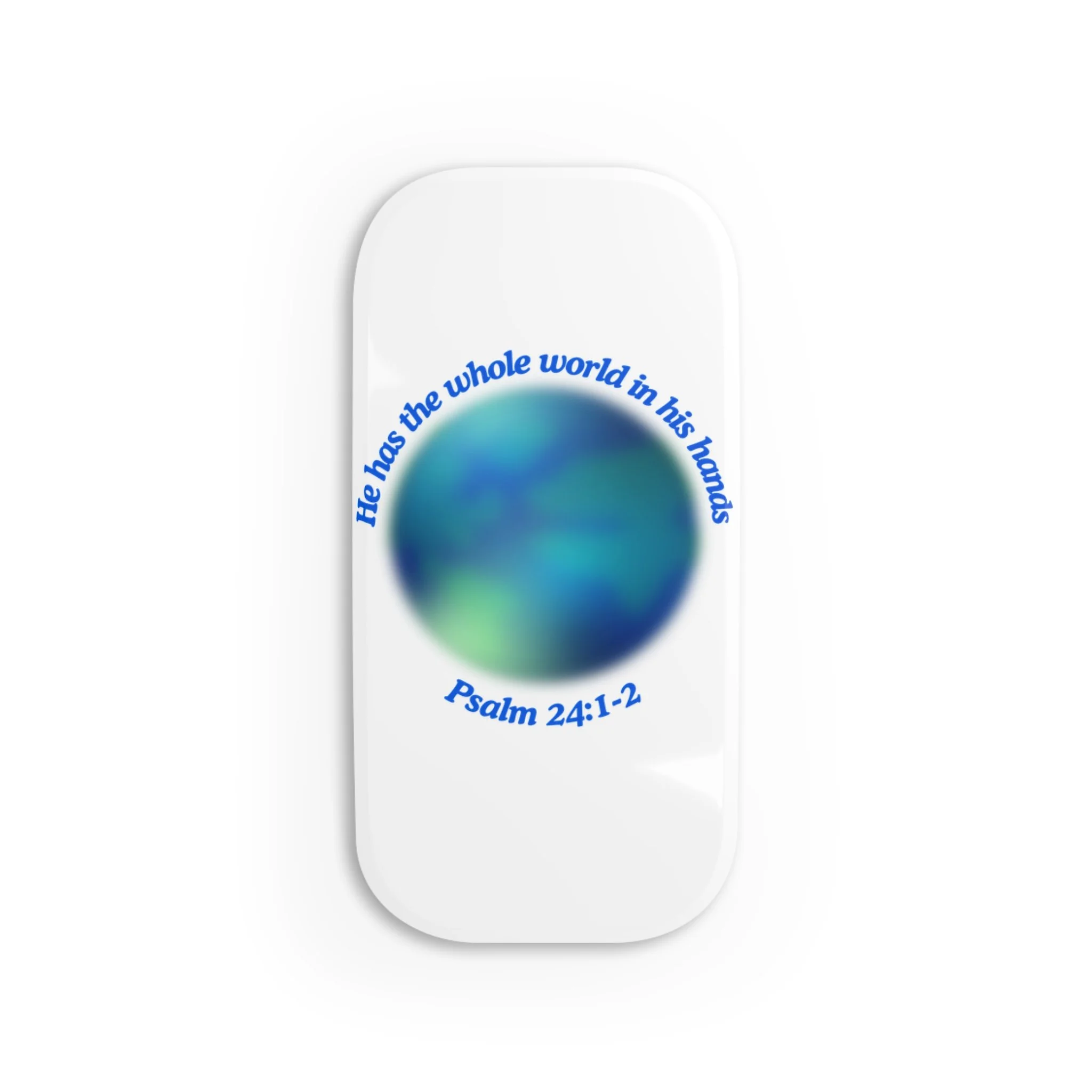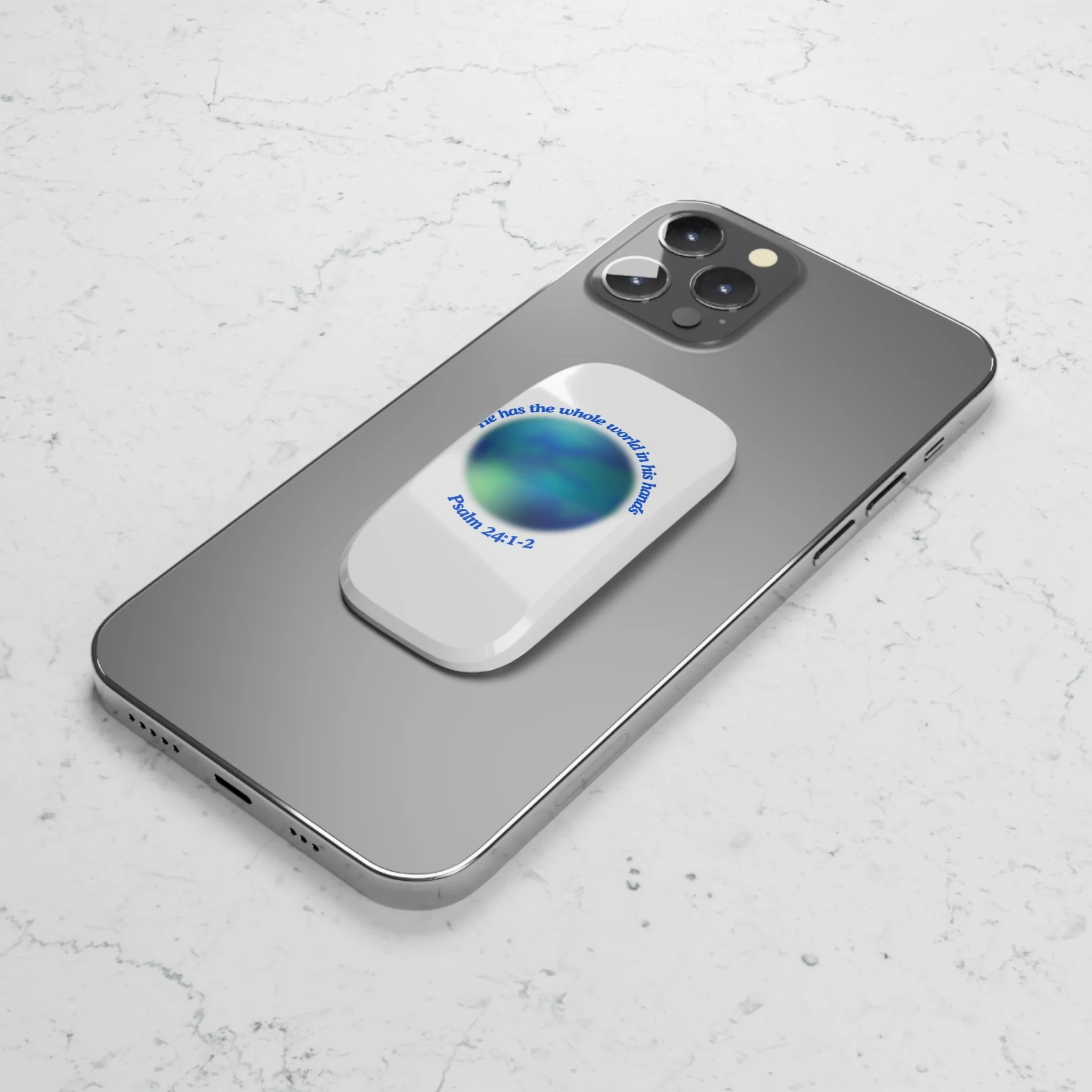 Hold a quiet reminder in your palm. This slim click-on grip features a soft-focus globe with a gentle blue-green haze and the comforting words from Psalm 24:1-2 curved around it. It settles into your hand effortlessly, tucking into daily rituals — morning coffee, quick photo snaps, or a late-night video call — and flips out to cradle your phone when you need a steady view. The design reads like a small, calm affirmation: a faith-centered nudge that the world rests in steady hands.