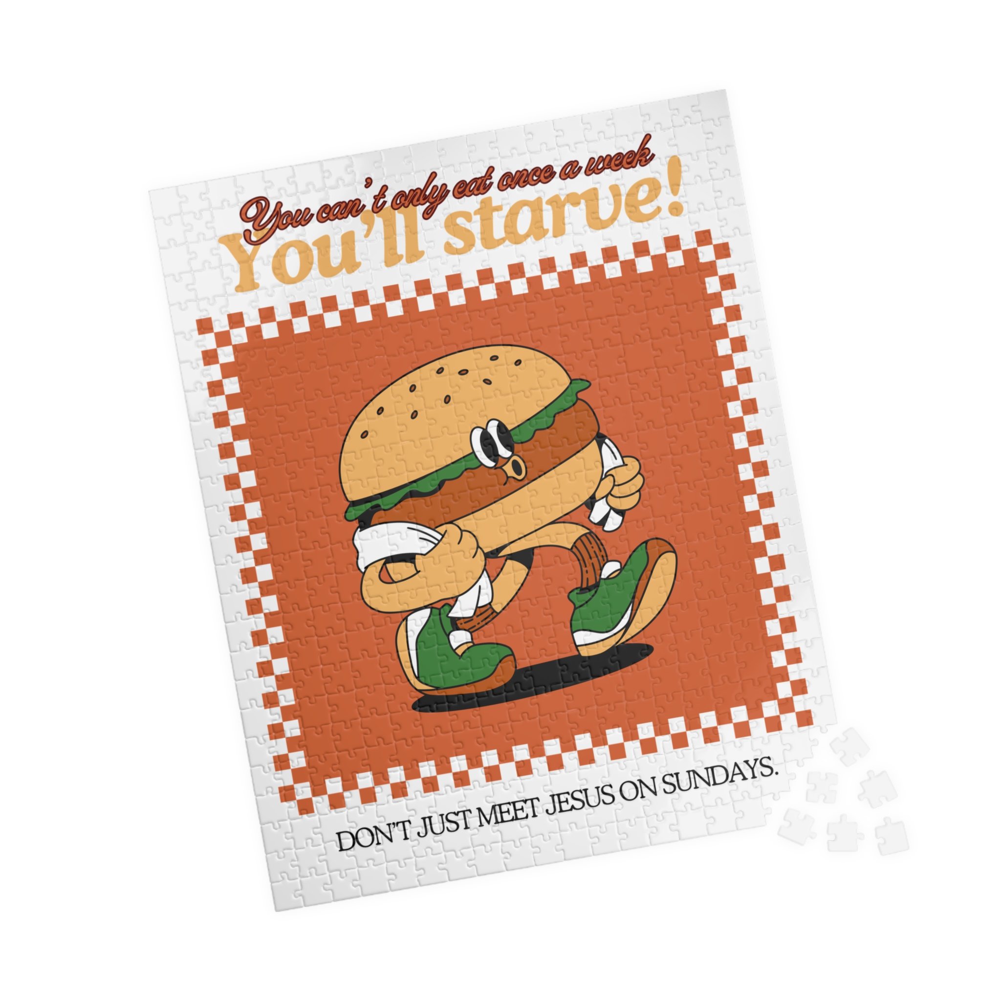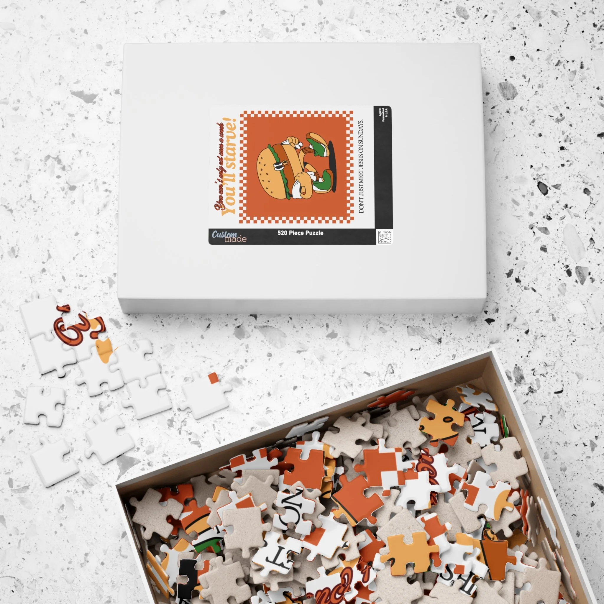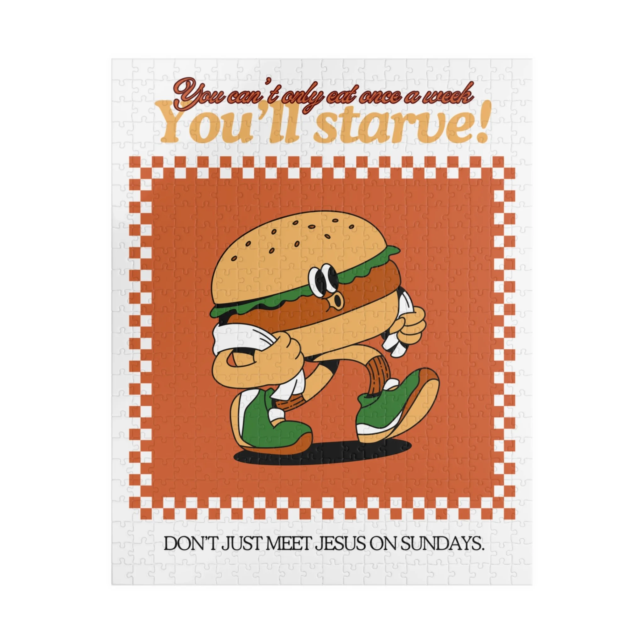 Piece together a quirky, retro-inspired scene with this high-quality chipboard puzzle that turns a familiar diner-style mascot into a playful reminder about faith and fellowship. The design centers on a vintage cartoon cheeseburger character striding confidently against a warm, checkerboard backdrop, with cheeky headline text above and a subtle devotional line below. Bright, saturated inks and a glossy laminated finish make the colors pop across every piece. Whether you're easing into a cozy evening of puzzling or gathering around the kitchen table with friends, this puzzle invites shared laughs and thoughtful conversation as the image comes together.