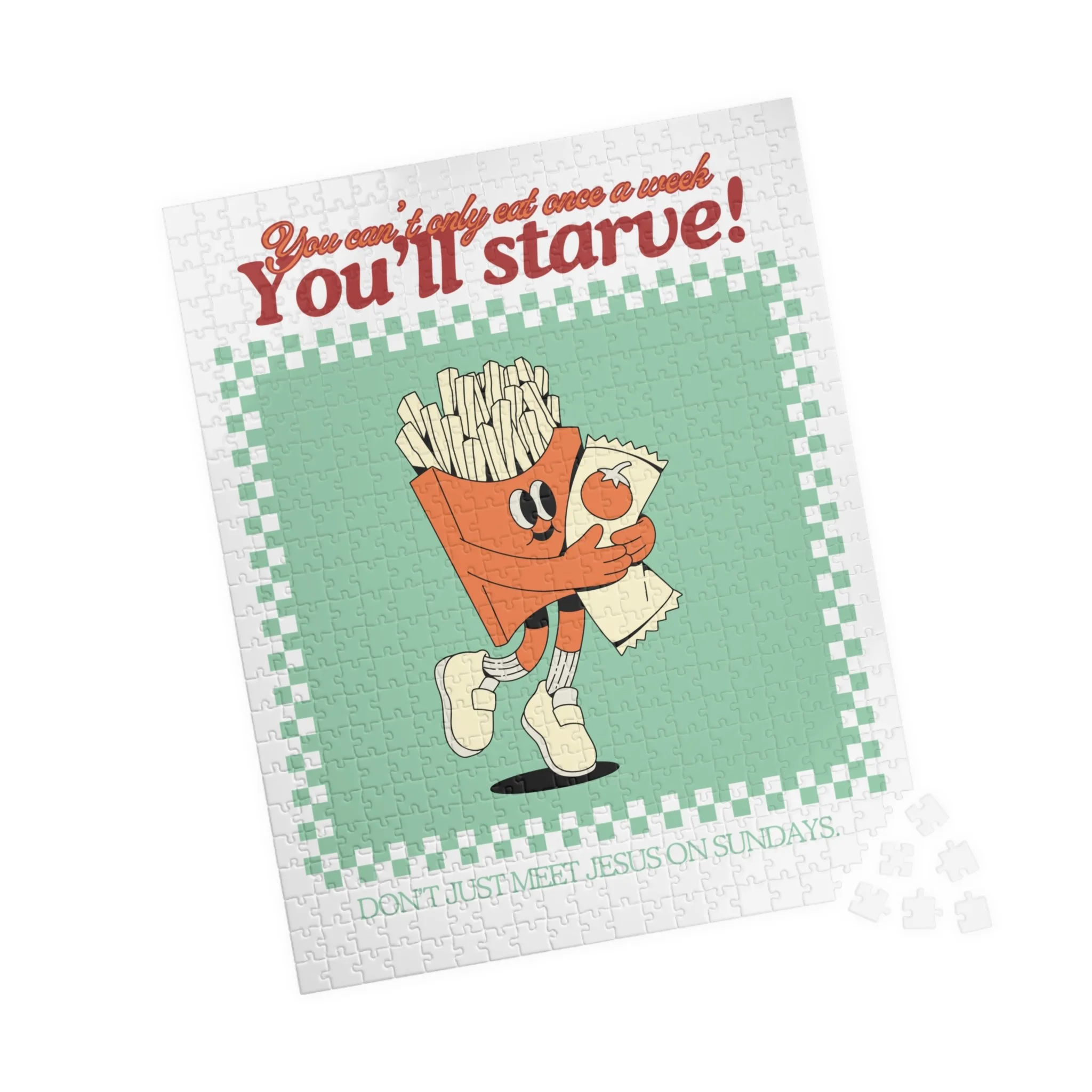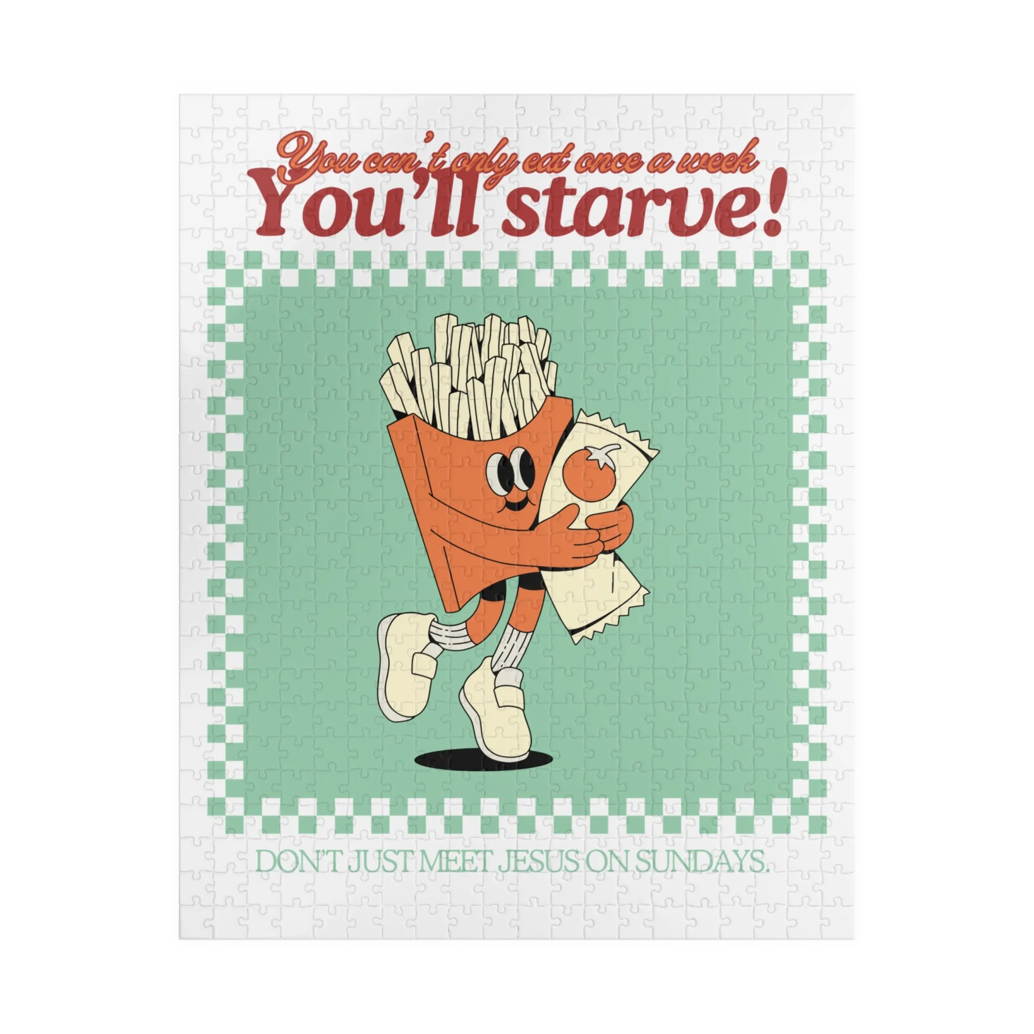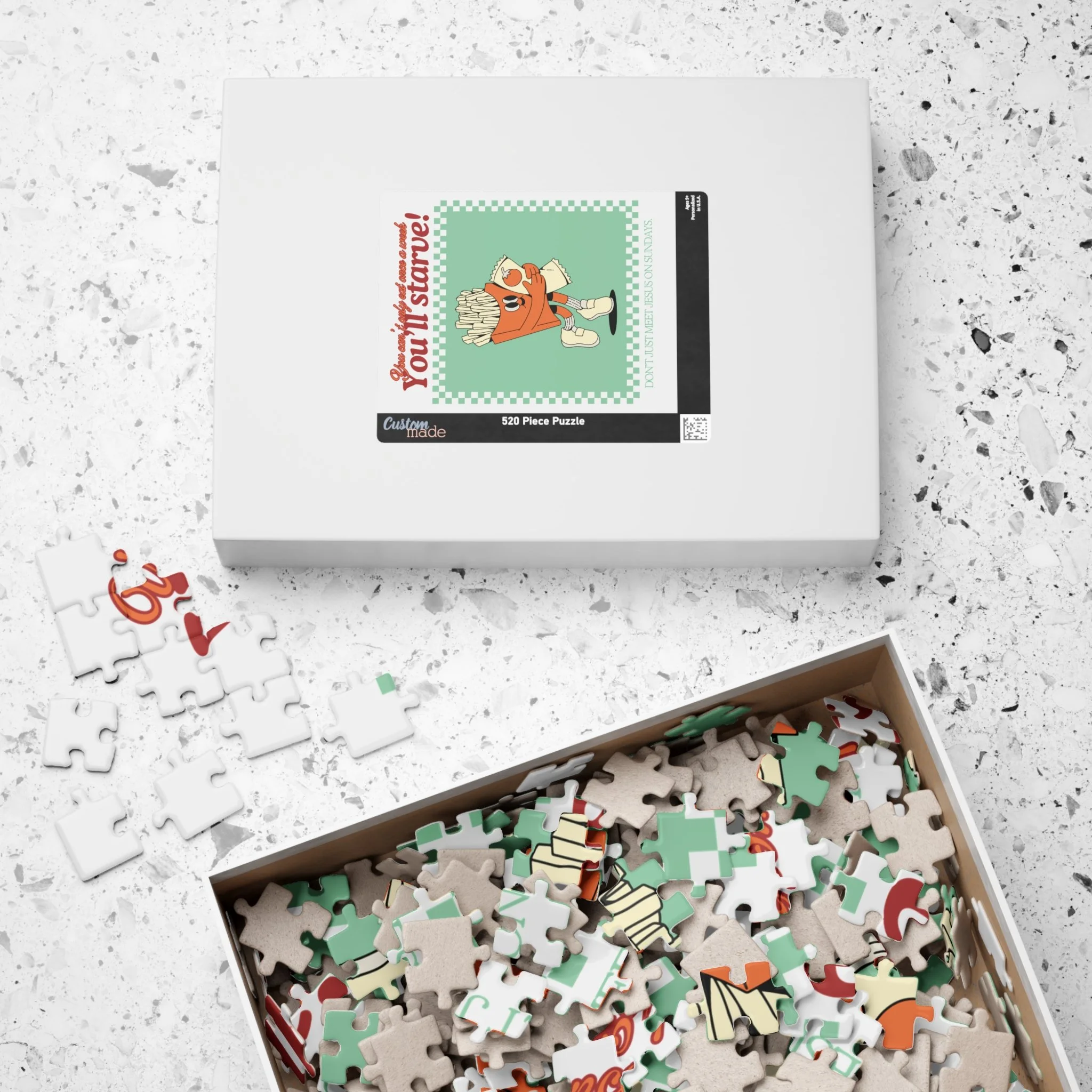 Bring playful retro charm to quiet evenings with a high-quality chipboard puzzle that invites laughter and focus. The illustration — a cheeky walking fries character framed by a mint-green checkerboard — feels like a found poster from a sunny diner. Pieces snap together with a satisfying fit and a glossy laminated face that locks in bright, crisp colors. The printed paper box keeps everything neat and makes it easy to store between sessions.