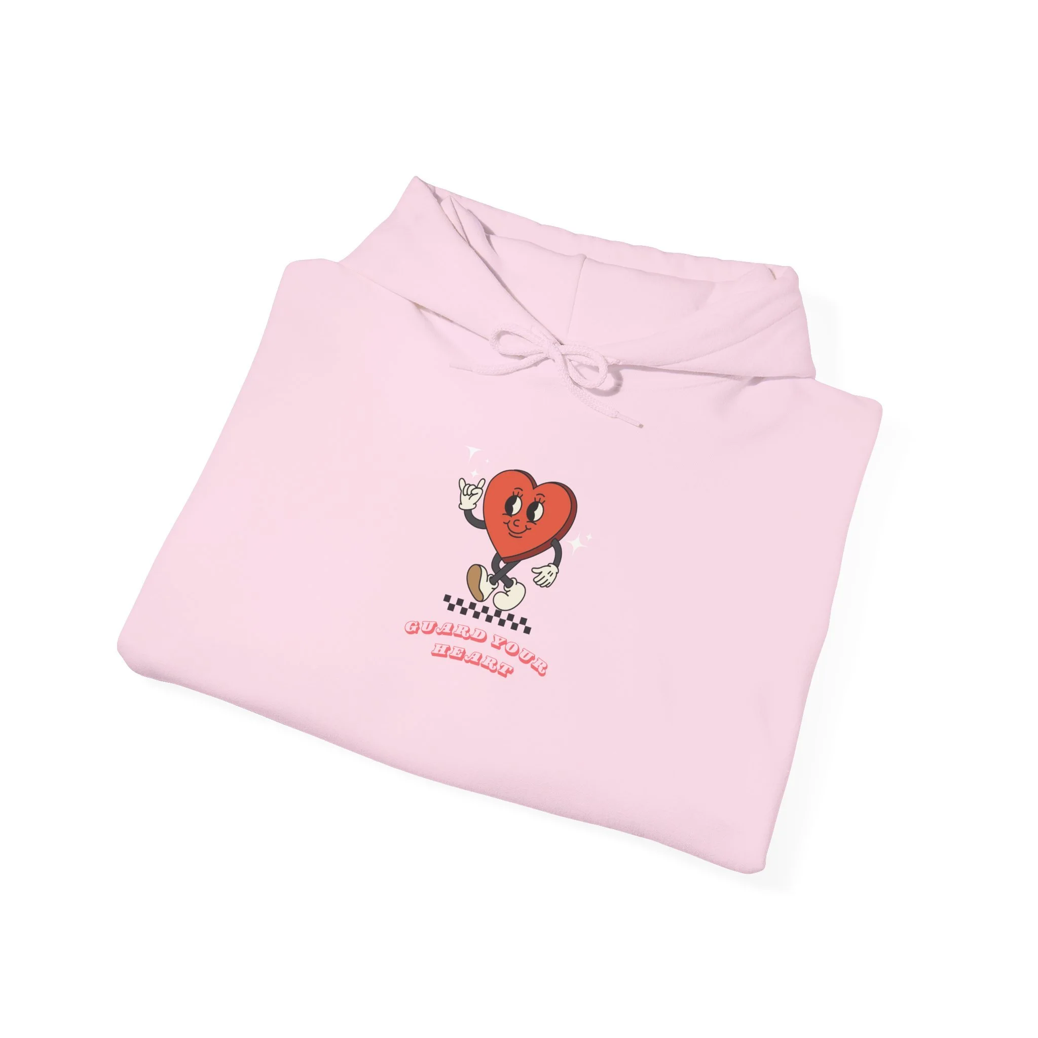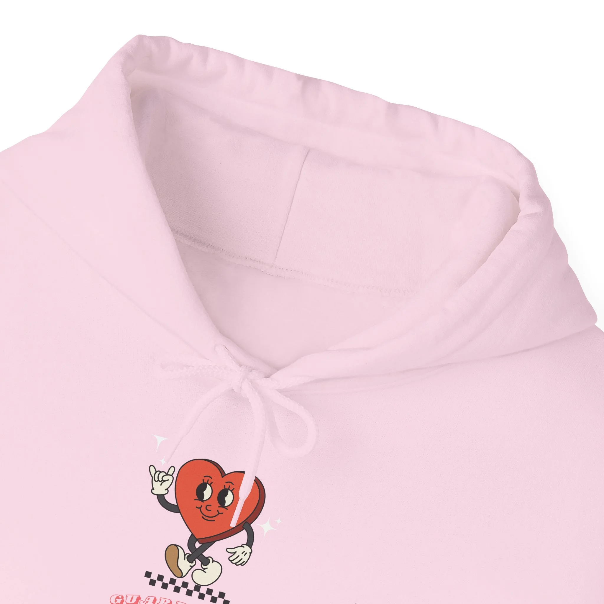 This soft, midweight hoodie brings a playful, heart-forward energy to everyday wear. Blush-pink fabric holds a small, hand-drawn heart character at the chest while bold rows of bright red hearts march down both sleeves. It drapes comfortably without feeling bulky, and small details like the color-matched drawcord and tear-away label keep the look tidy. The message is sweet, to guard your heart. Whether it's from evil, the wrong friend group, or temptations you may experience.