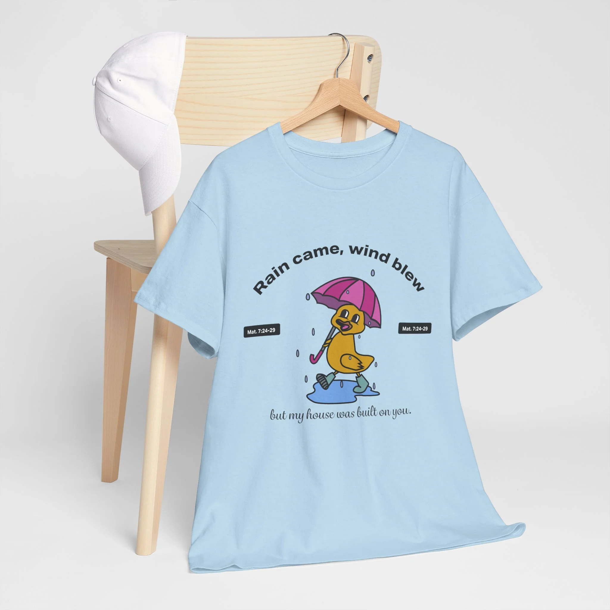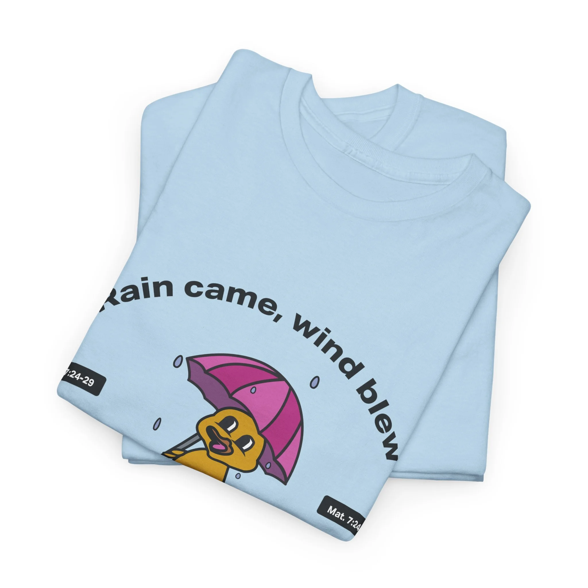 Matthew 7:25, "And the rain descended and the floods came, and the winds blew and beat upon that house; and it fell not, for it was founded upon a rock."